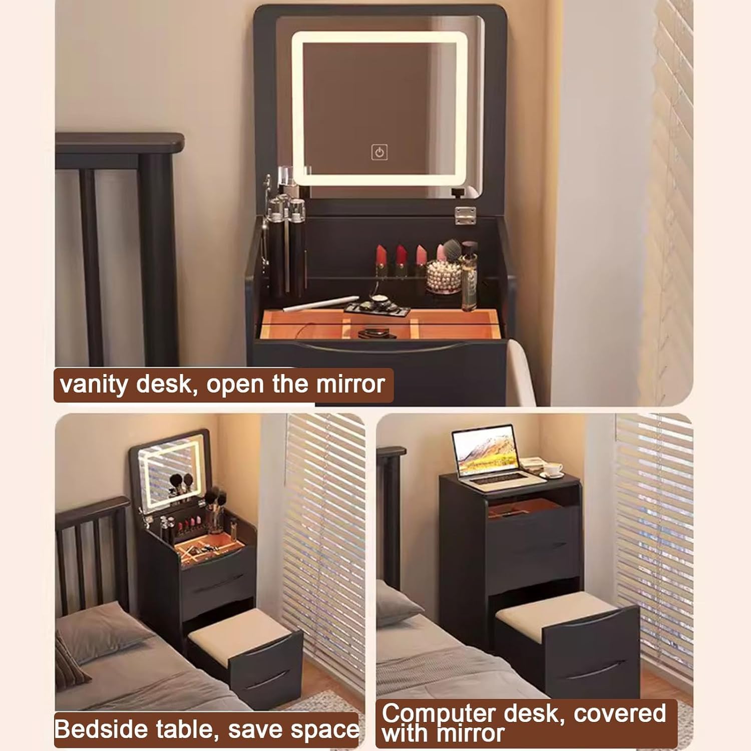 Detta innovativa 3-i-1-sminkbord kombinerar sminkbord, nattduksbord och pall i en stilren möbel. Fäll upp spegeln för att förvandla det till en komplett sminkstation – eller fäll ner den för att använda som ett elegant nattduksbord. Perfekt för mindre sovrum, studentrum eller andra yteffektiva hem.