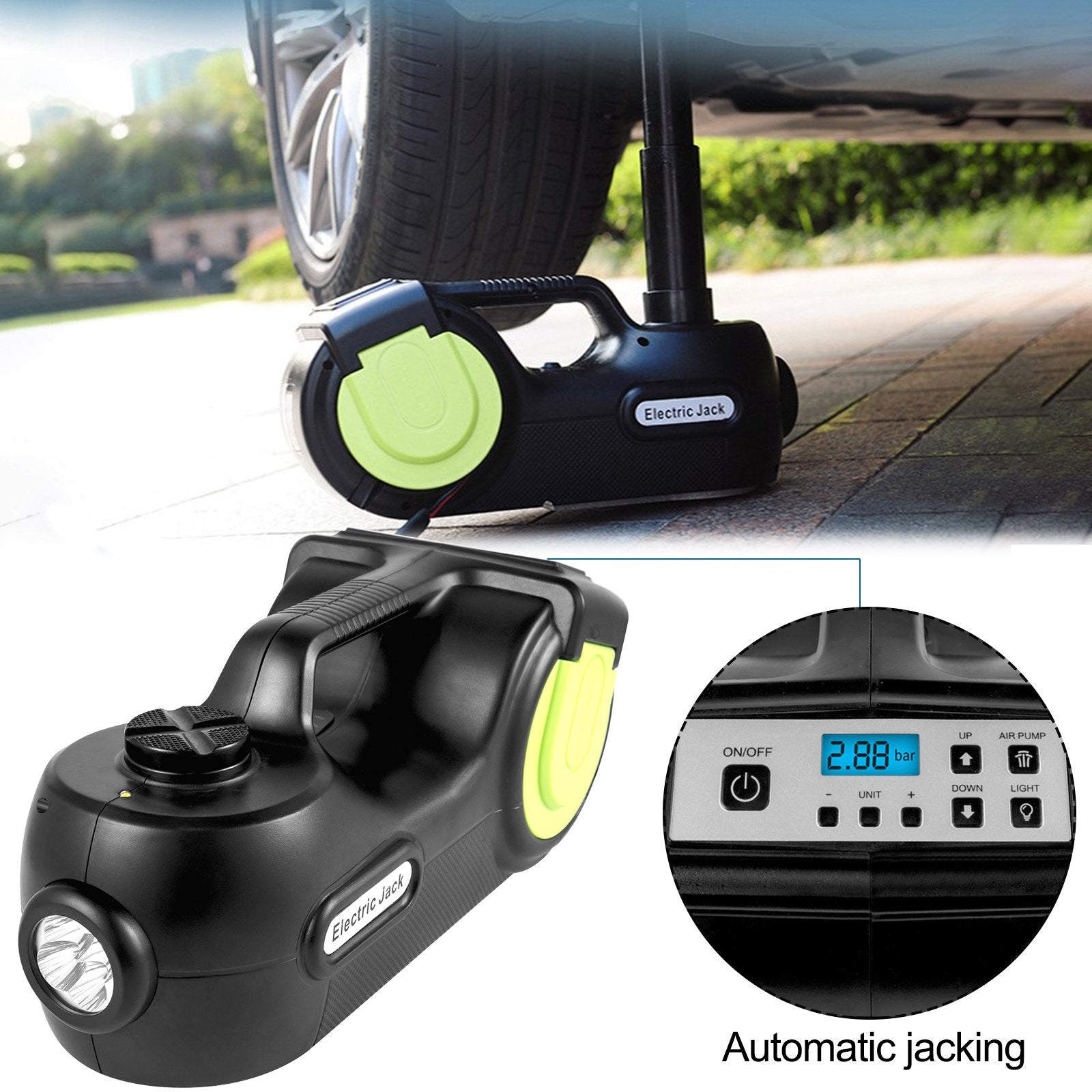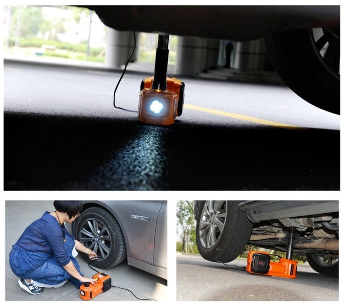 Inflation & Lifting Combo: Vår elbilsdomkraft kombinerar pump- och lyftfunktioner, med 3 standardmunstycken för att pumpa upp däcket på några minuter. Den hydrauliska domkraften förbättrar effektiviteten vid byte av däck.